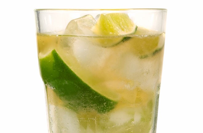 Pour over ice in a tall glass. Garnish with a lime wedge.