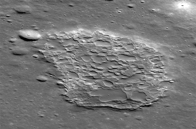 An oblique view of the 2-km-wide Ina from LRO. The raised smooth mounds and lower rough depressions are evident here. NASA/GSFC/Arizona State University.